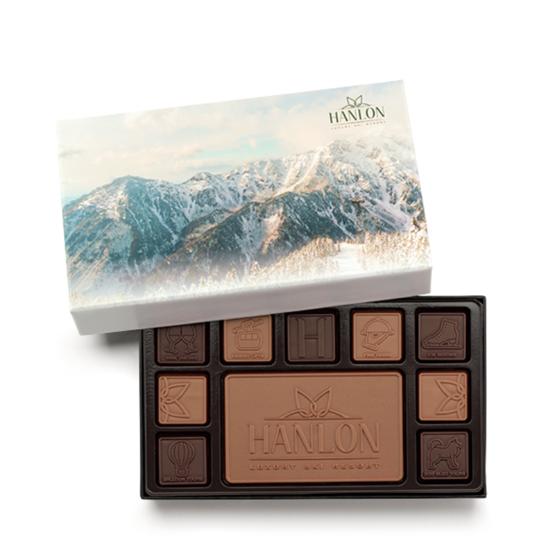 - Your own 3 x 5″ custom Belgian milk or dark chocolate centerpiece is surrounded by alternating engraved milk and dark chocolate thin squares, stacked in two layers per slot.