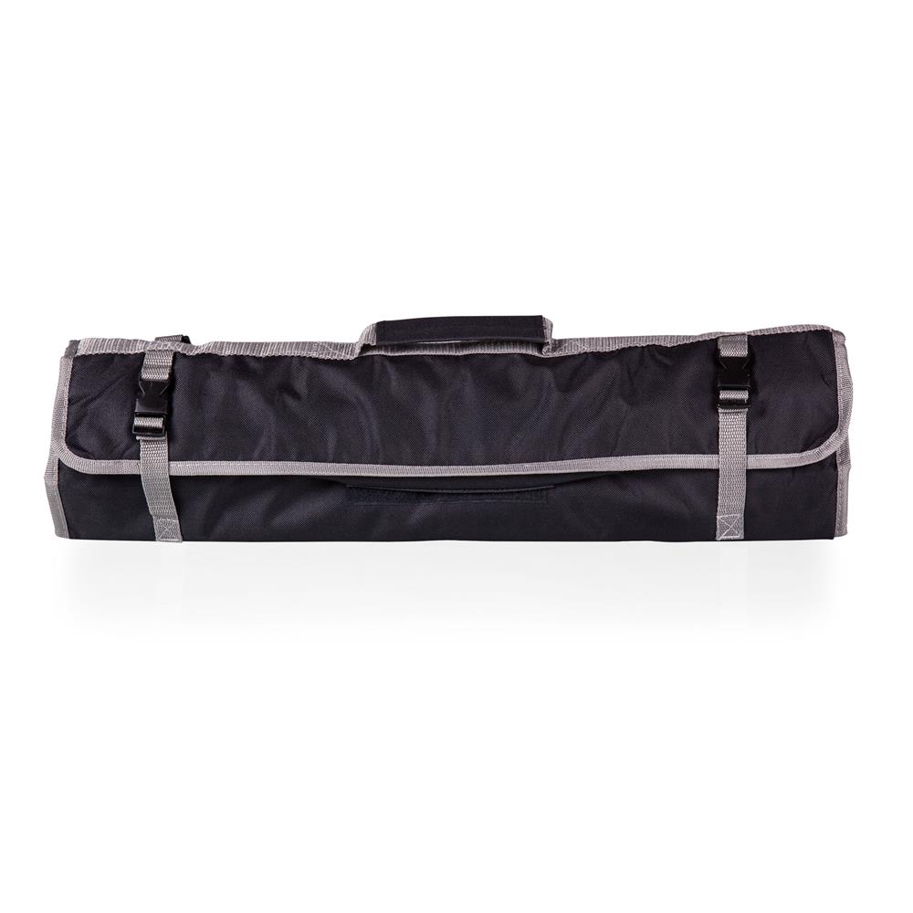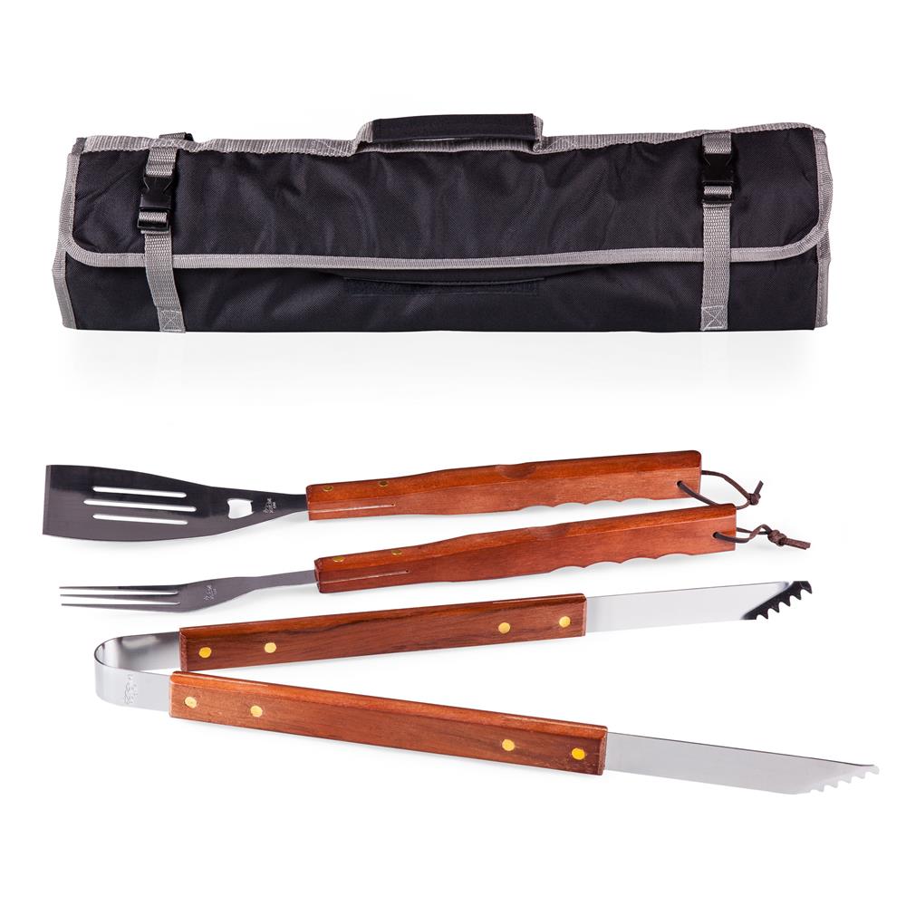3-piece BBQ tool set, folds into an easy-to-carry tote with handle and carrying strap. Made of polyester canvas.