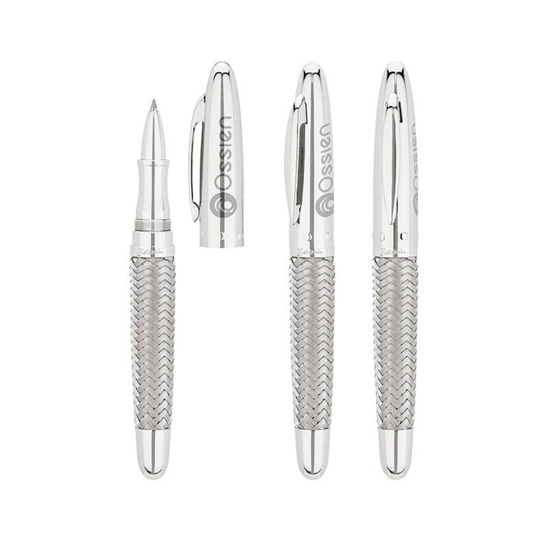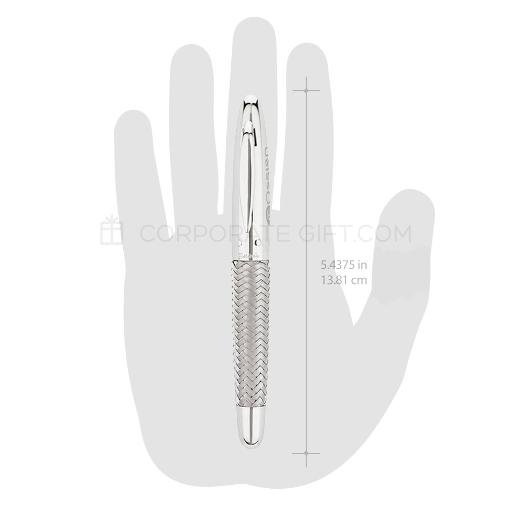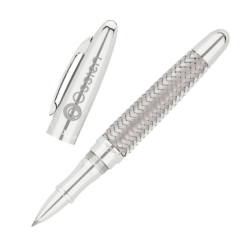 This solid brass rollerball features a Euro-style screw-off cap design, a woven steel barrel, chrome metal clip and trims, and a German-made black ink refill.