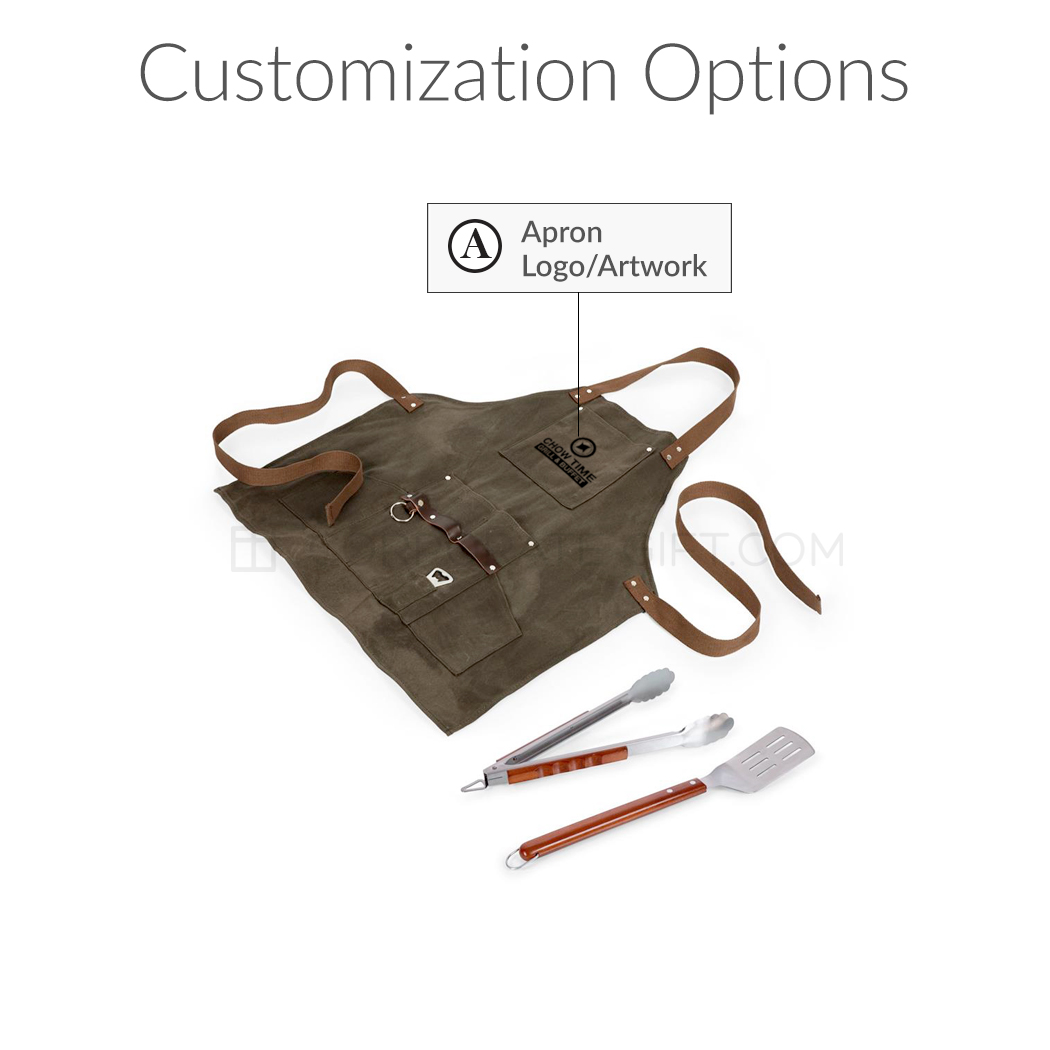 $69 one-time setup fee. Price includes apron, bbq tools and a one-color imprint in one location. A virtual mock up will be sent out for approval prior to processing.