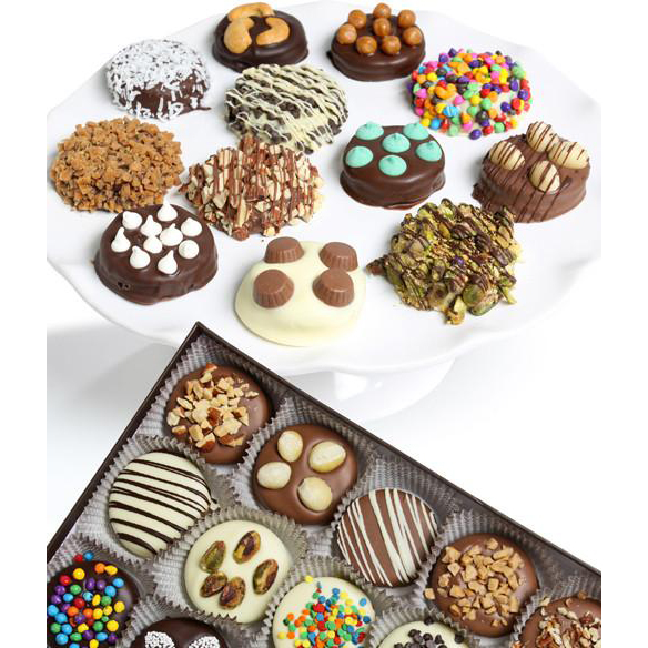 Fun and festive cookies! Our Artisans took the world's favorite sandwich cookie and turned it into a delicious gourmet treasure. Oreo® Cookies are dunked in luscious Milk, Dark and White Belgian Chocolates, then carefully rolled and decorated with a harvest of nuts and hearty candies. Packaged in a fashionable gift box, the tasty cookies are crafted in a gourmet kitchen by Artisans in small batches. None of the hand-decorated dessert gifts will be exactly identical. Toppings and flavors may vary.