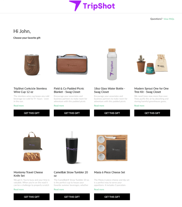Every year, TripShot sends out 300+ customer appreciation gifts during the holiday season. They also participate in multiple conferences and tradeshows. Both efforts required sourcing gifts from various vendors. The TripShot team would then have to break down all the gifts, repackage them, label the boxes, and handle all the recipient shipping themselves. The effort took about a week and many after-work hours, not to mention the time and cost of travel to the office for their distributed workforce.