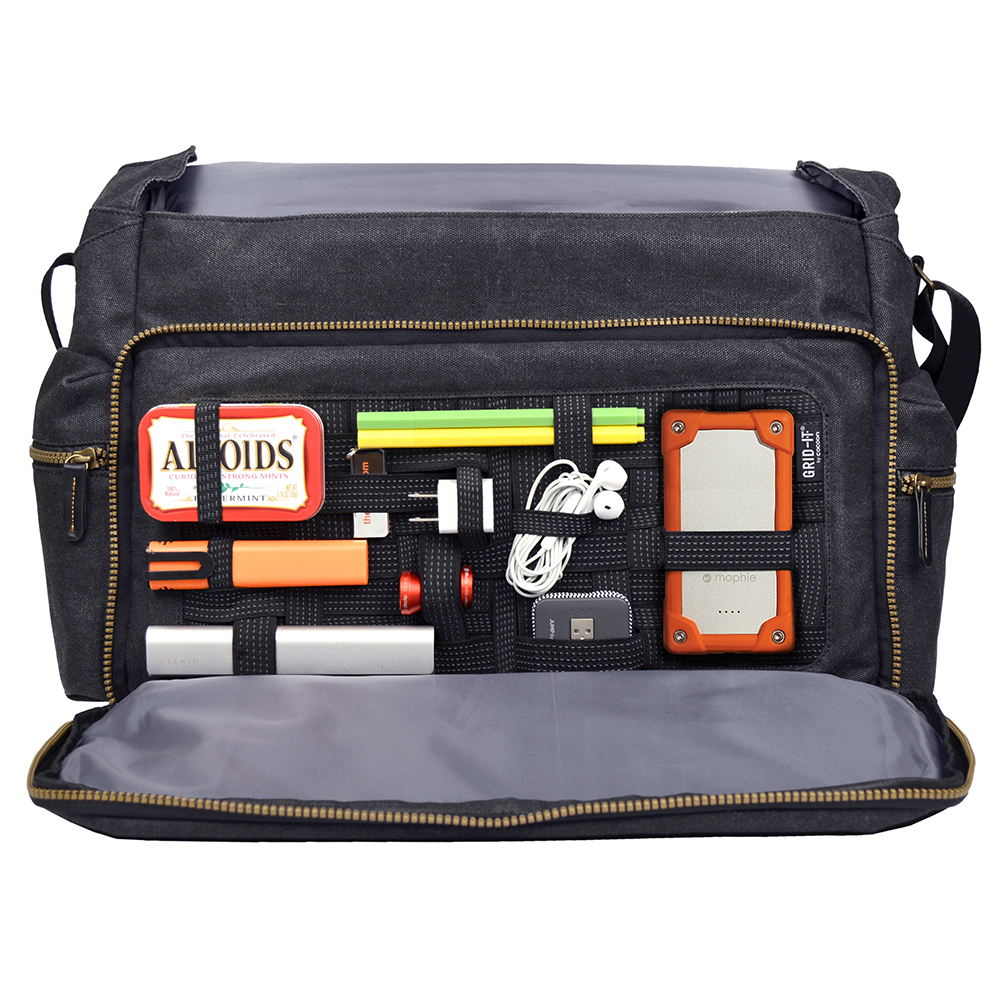 On the inside, there are padded compartments for up to a 16'' laptop and tablet, as well as a built-in Grid-It!® organizer. The Grid-It!® Organizer is what really makes this messenger bag ready for a day in the city.