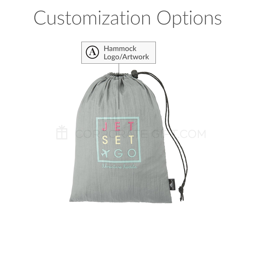 $55 one-time setup fee. Price includes packable hammock and a one-color imprint in one location. A virtual mock up will be sent out for approval prior to processing.