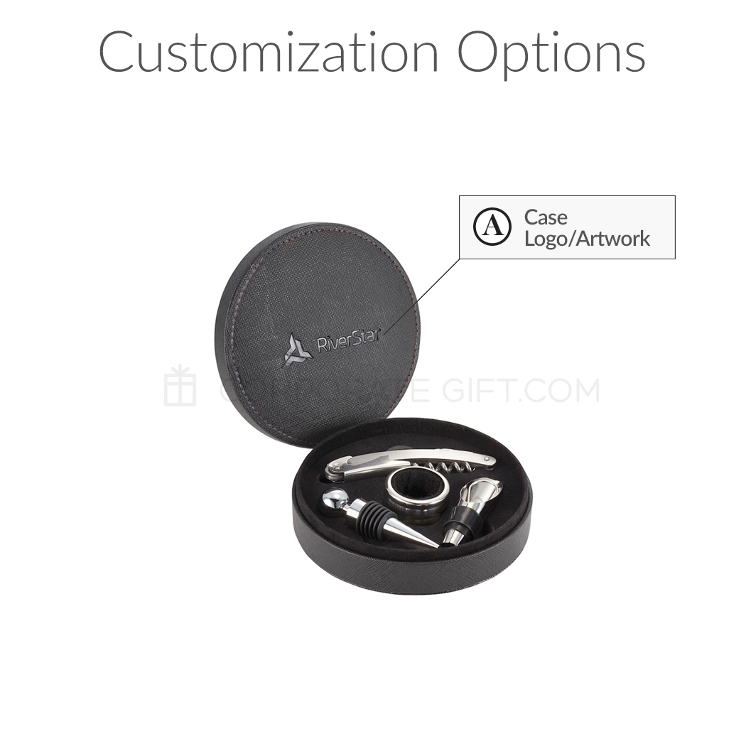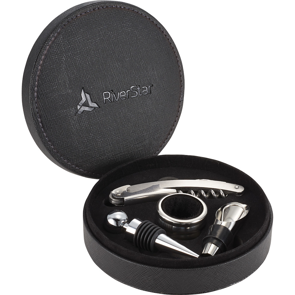 The five-piece Modena wine gift set includes a stopper, waiter corkscrew, drip ring and pourer in a fine detailed UltraHyde gift box. This retail-inspired gift set is perfect for any gifting occasion.