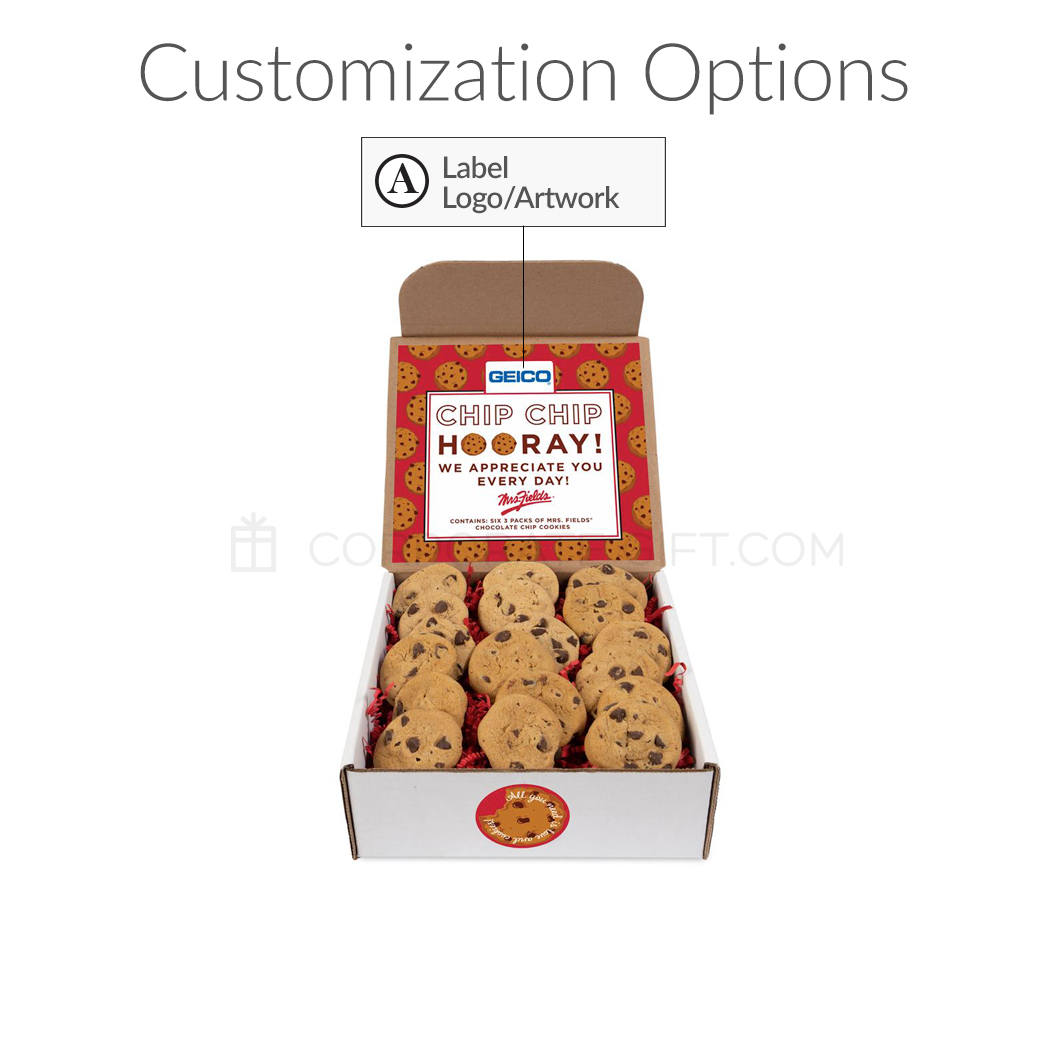 Our Mrs. Fields cookie mailer is filled with (6) cello-wrapped 3 packs of freshly made Mrs. Fields® Chocolate Chip Cookie Nibblers.