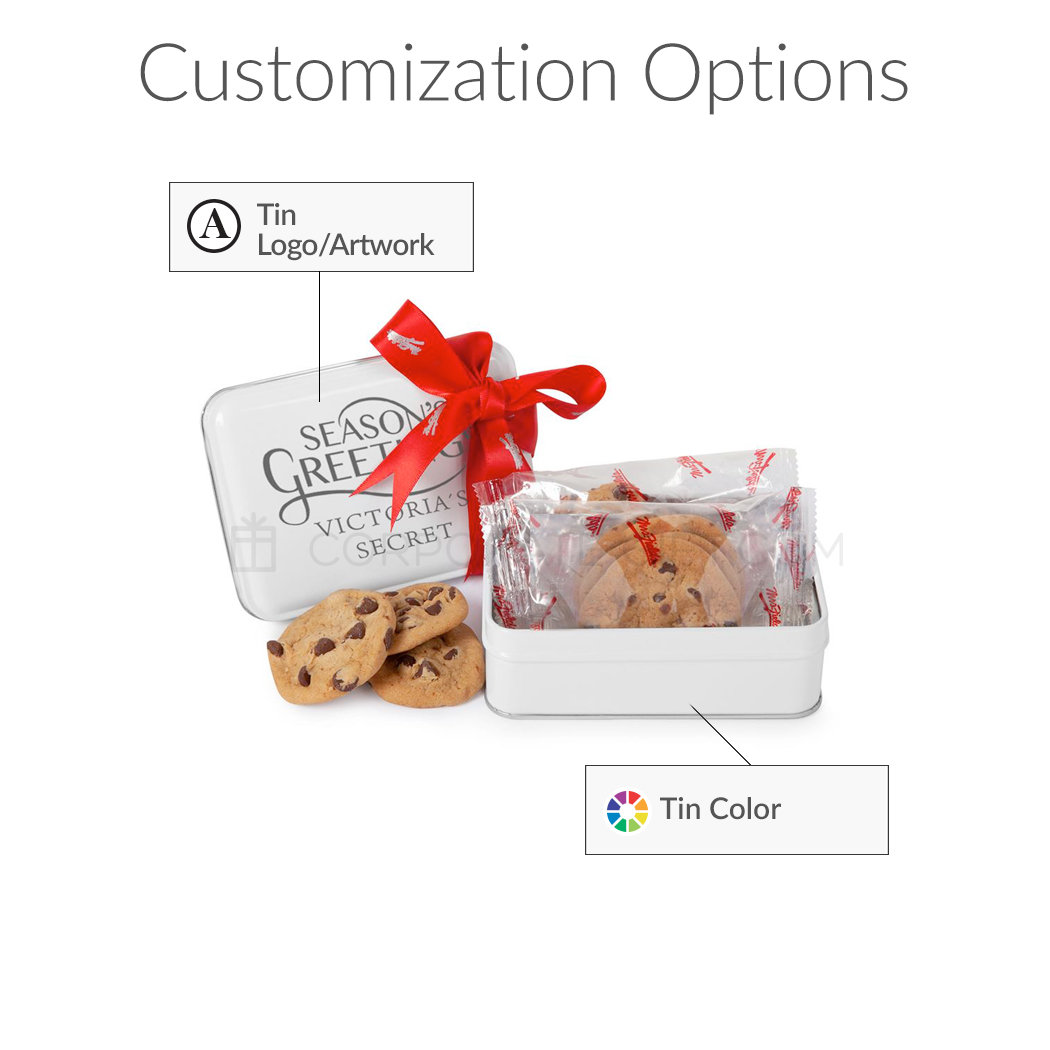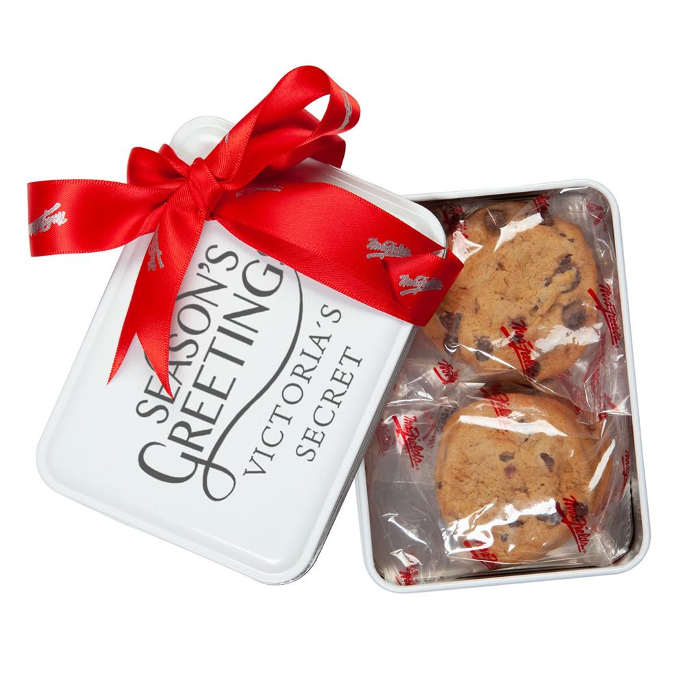 Our keepsake tin is filled with (2) 3 packs of freshly made Mrs. Fields® Chocolate Chip Cookie Nibblers. Comes with a customizable lid and a Mrs. Fields® hand-tied ribbon.