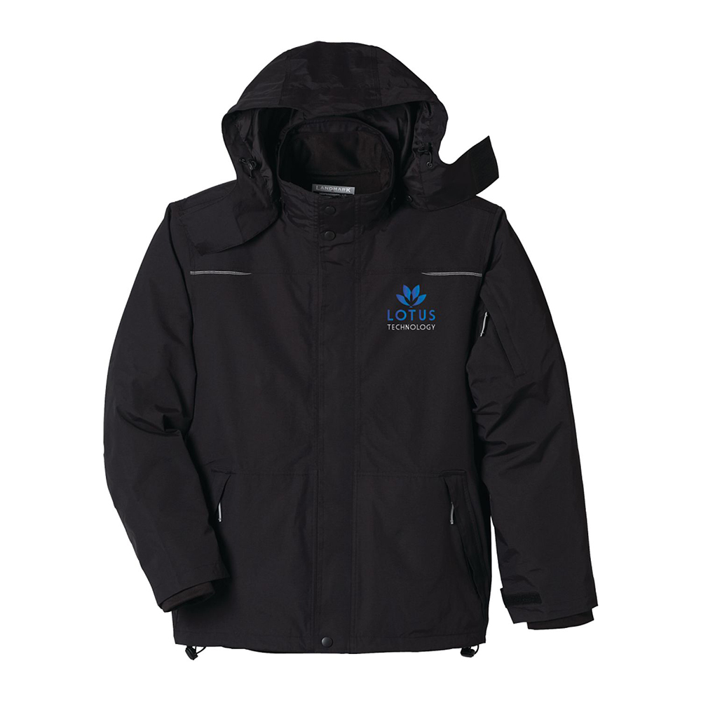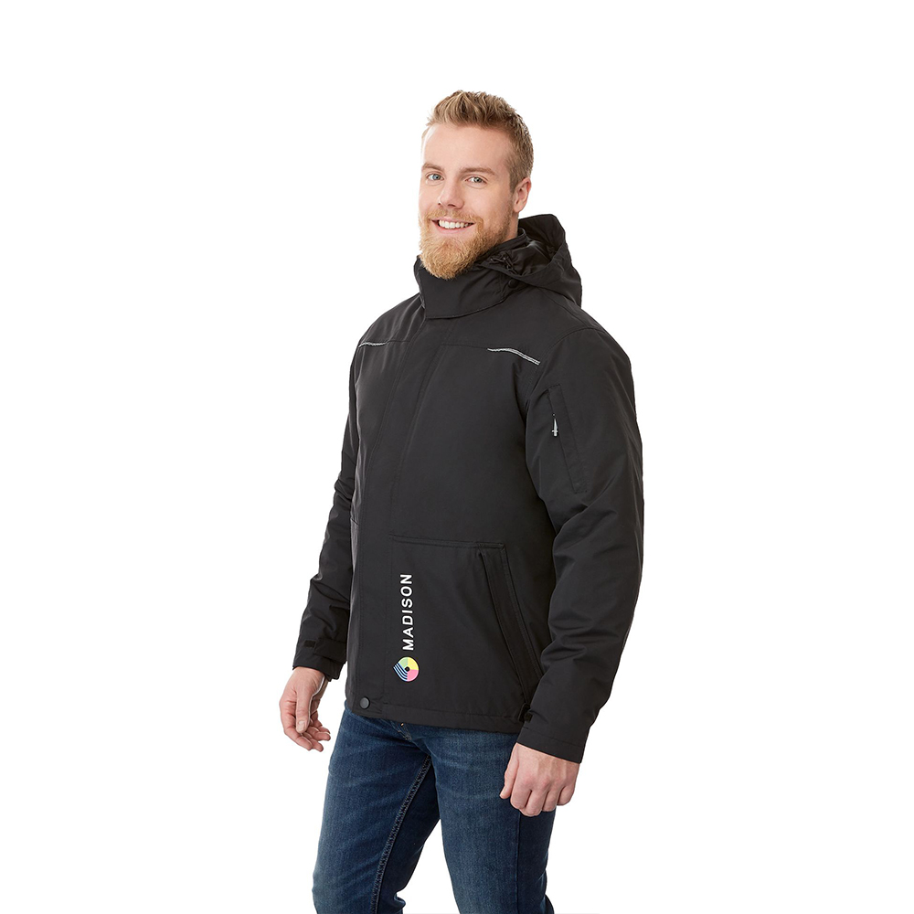 The Dutra 3-in-1 Jacket, available in men's sizes, will keep you ready for any weather! This fully seam-sealed multi-functional jacket is water repellent and breathable. It features a detachable snap-off hood with drawcord and interior cord locks. Fine detailing includes diminishing two-tone reflective piping and triple needle topstitching. The sleeves are engineered with adjustable self fabric cuff tabs with hook-and-loop closure and articulated elbows. With interior system snap tabs for a liner add in. The accompanying liner with coverstitch detail features an exposed plastic zipper with oxidized dark slider and puller. The jacket features lower patch pockets and an interior pocket with hook-and-loop closure and system loops at the neck and lower sleeves.
