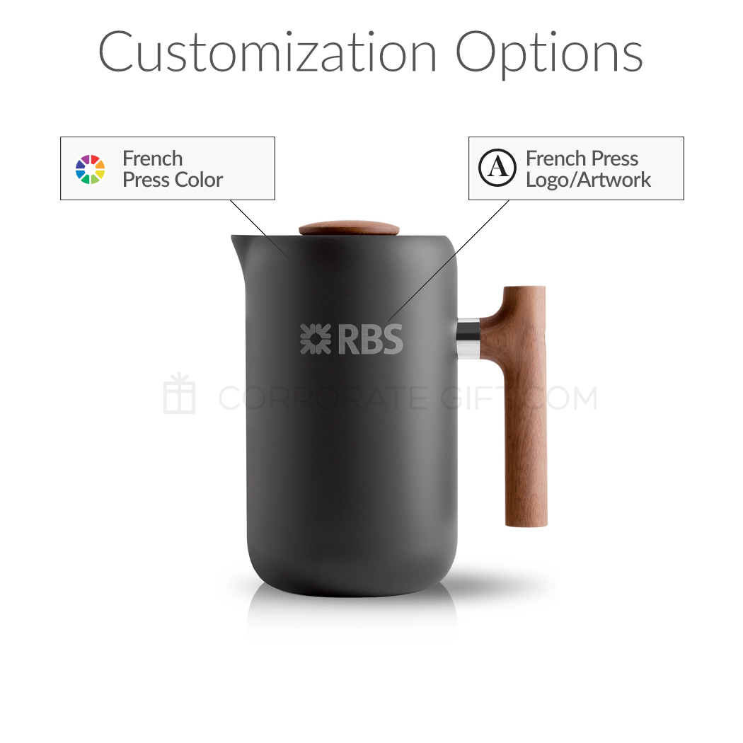 $50 one-time setup fee. Price includes french press and a laser-engraved imprint in one location. A virtual mock-up will be sent out for approval prior to processing.