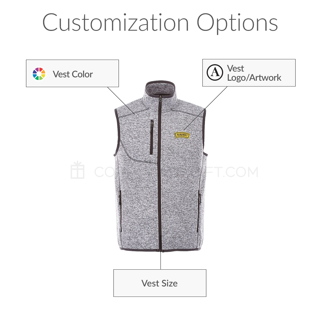 $55 one-time setup fee. Price includes vest and an embroidered imprint in one location. A virtual mock-up will be sent out for approval prior to processing.