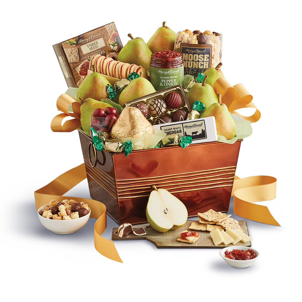 There are so many reasons to share a gift brimming with gourmet snacks. First are exceptional pears, then sweets like buttery raspberry galettes from Harry & David's bakery and irresistible Moose Munch® Premium Popcorn. There are tempting savory snacks as well, including Harry & David's popular pepper & onion relish, sharp white cheddar cheese, and crackers.