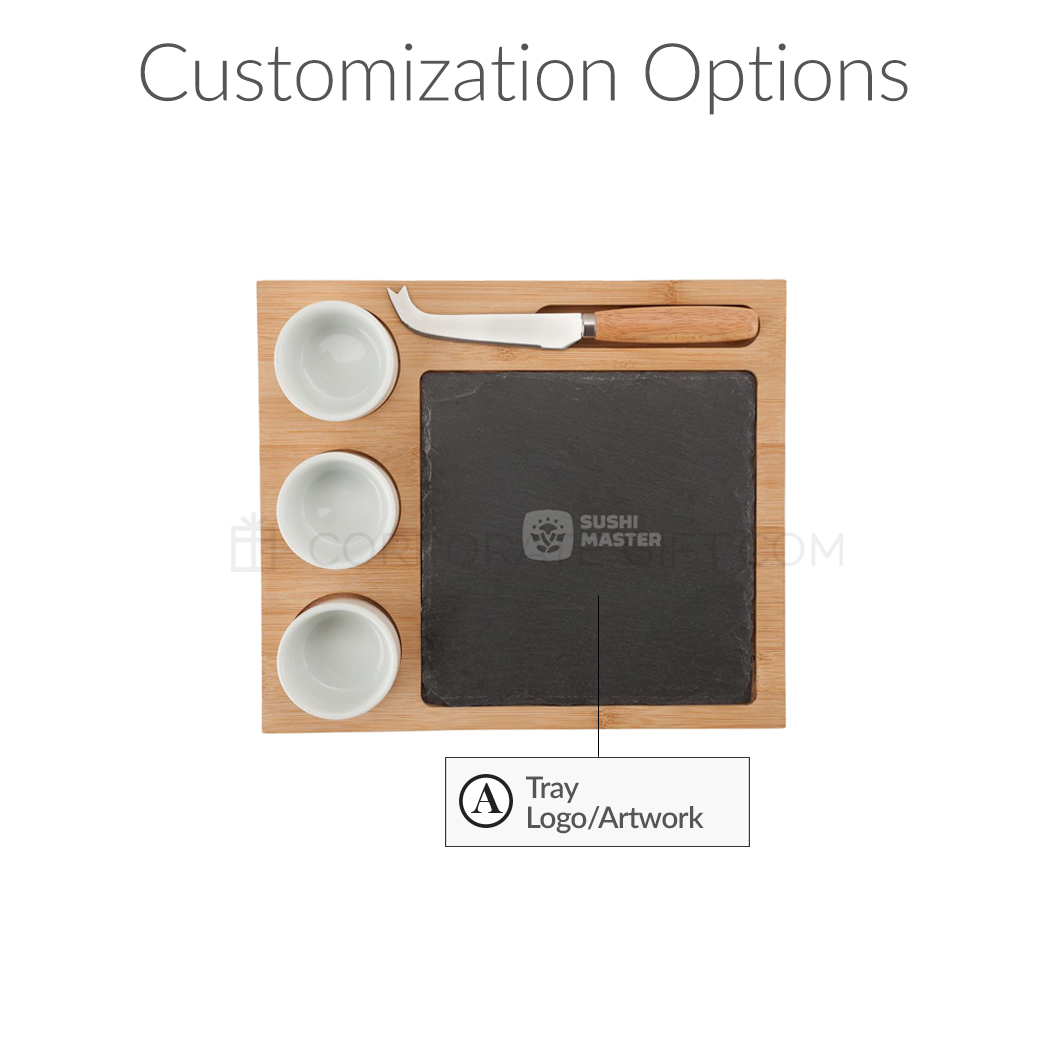$63 one-time setup fee. Price includes cheese set and a laser-engraved imprint in one location. A virtual mock up will be sent out for approval prior to processing.