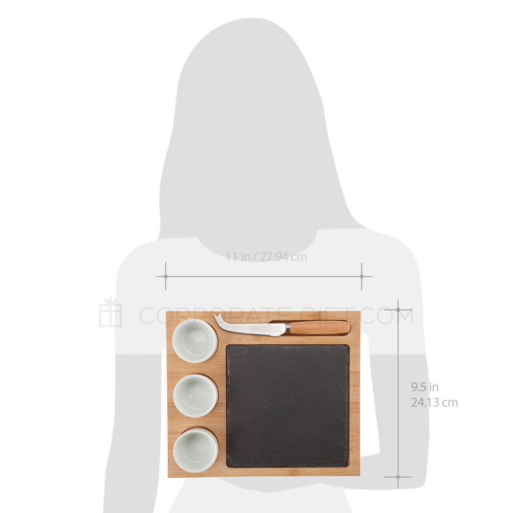The Masia 6-piece cheese and dip set is a perfect way to serve your appetizers. It includes 3 porcelain-finished dipping ceramic cups for delicious sauces or small snacks, a stainless-steel knife with a forked tip for hard cheeses and a slate cutting surface. All 5 removable pieces are inset on an elegant bamboo base for easy carrying and beautiful presentation. Each piece is FDA compliant.