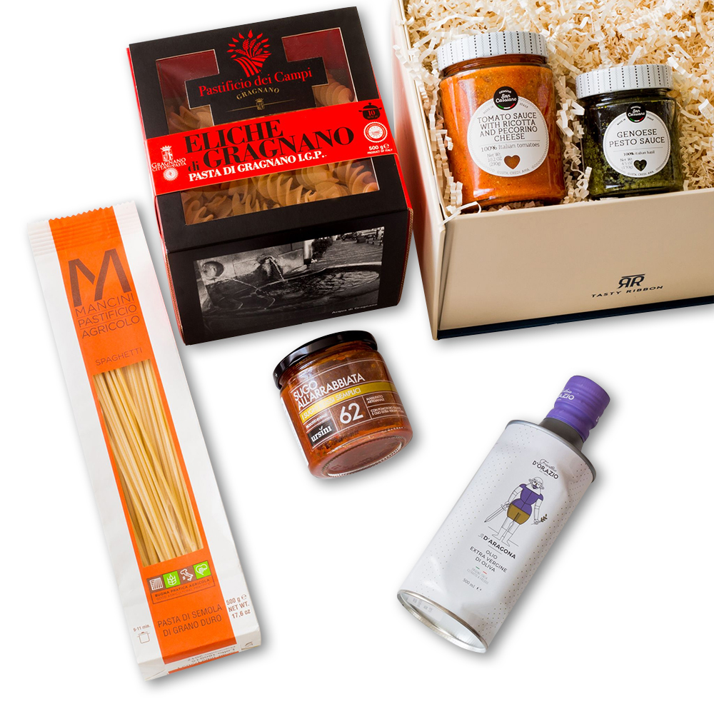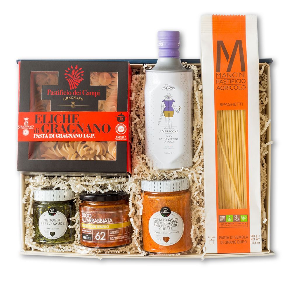 Give the gift of authentic Italian cuisine! The best starter kit to become a real pasta master! This box features two types of pasta, three divine sauces, and a gorgeous olive oil. The Mancini spaghetti marry beautifully with the basil pesto from Genova while the Eliche of Gragnano with their signature twisty shape can take on a bolder affair with the arrabbiata sauce or the ricotta and pecorino cheese tomato sauce. Both are soulmates to the Frantoio d’Orazio extra virgin olive oil that we suggest to pour over your dish for an extra touch of gourmet!