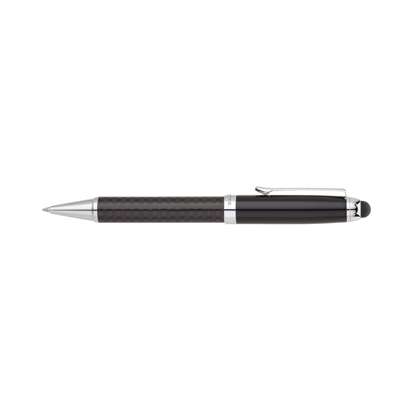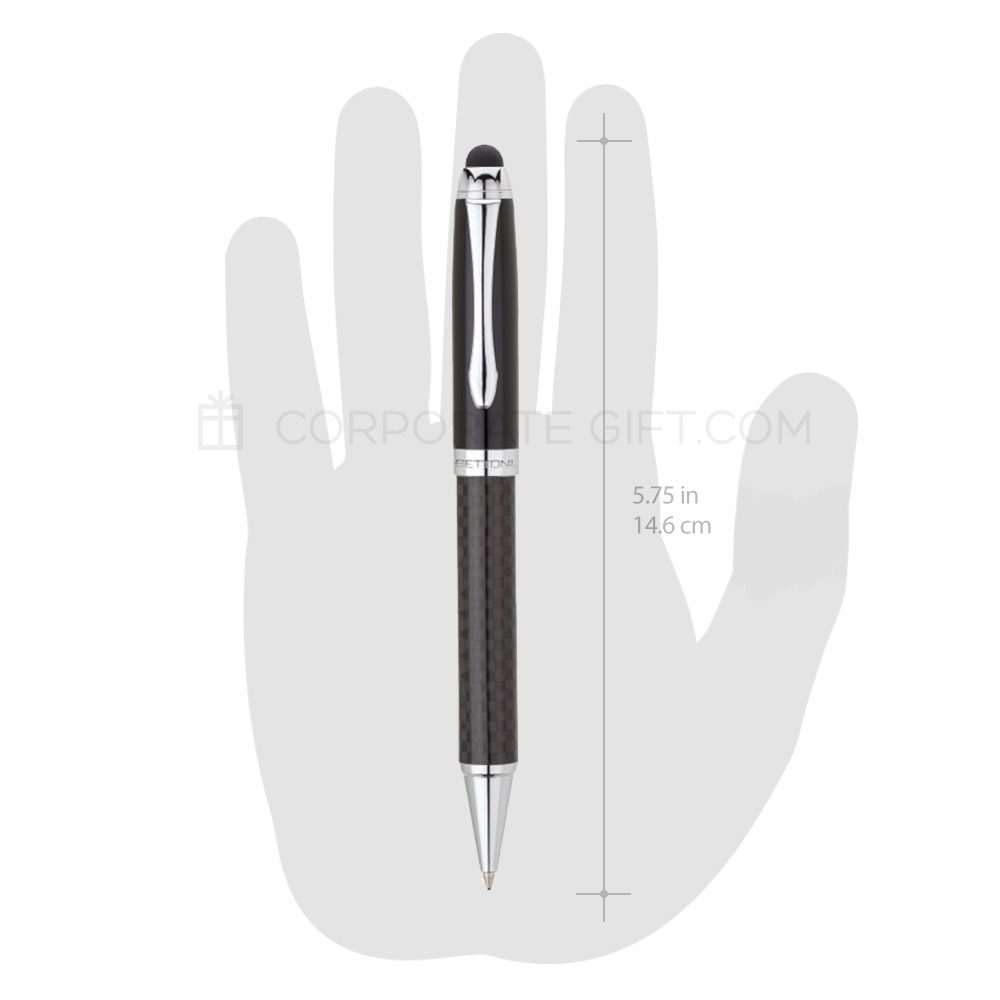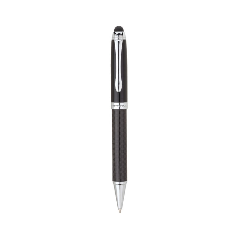 Brass twist-action Bettoni pen with carbon fiber barrel, chrome trims, and capacitive stylus that works with touch screen devices.