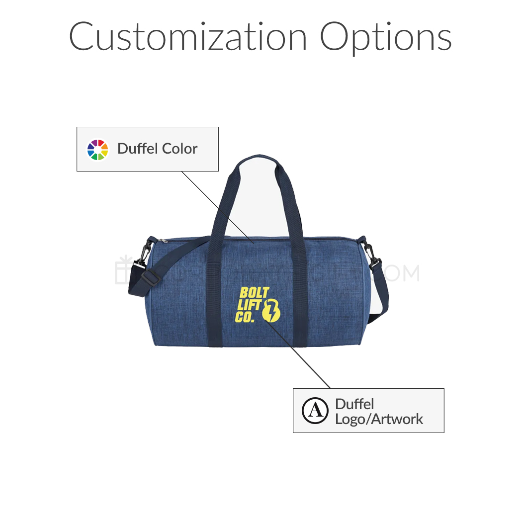 $55 one-time setup fee. Price includes duffel bag and a one-color imprint in one location. A virtual mock up will be sent out for approval prior to processing.
