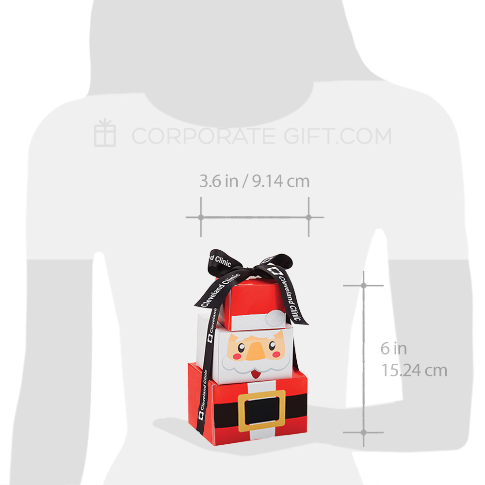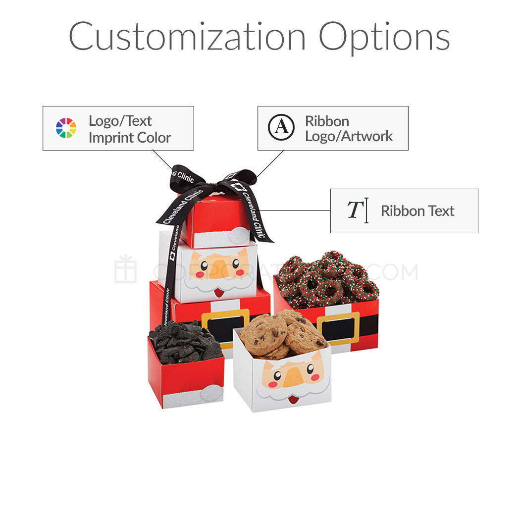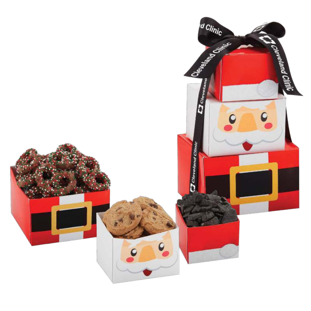Santa Tower packed with Chocolate Coal, Mini Chocolate Chip Cookies, and Chocolate Covered Holiday Sprinkled Pretzels