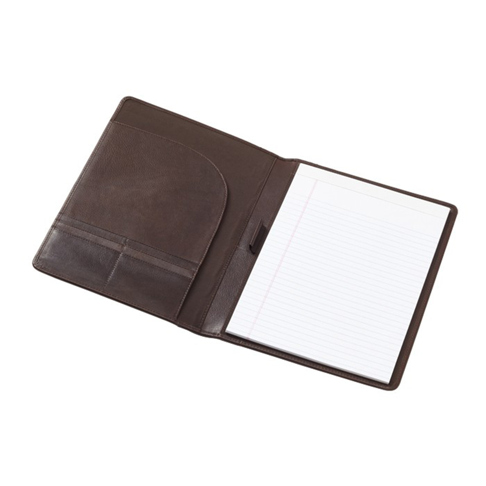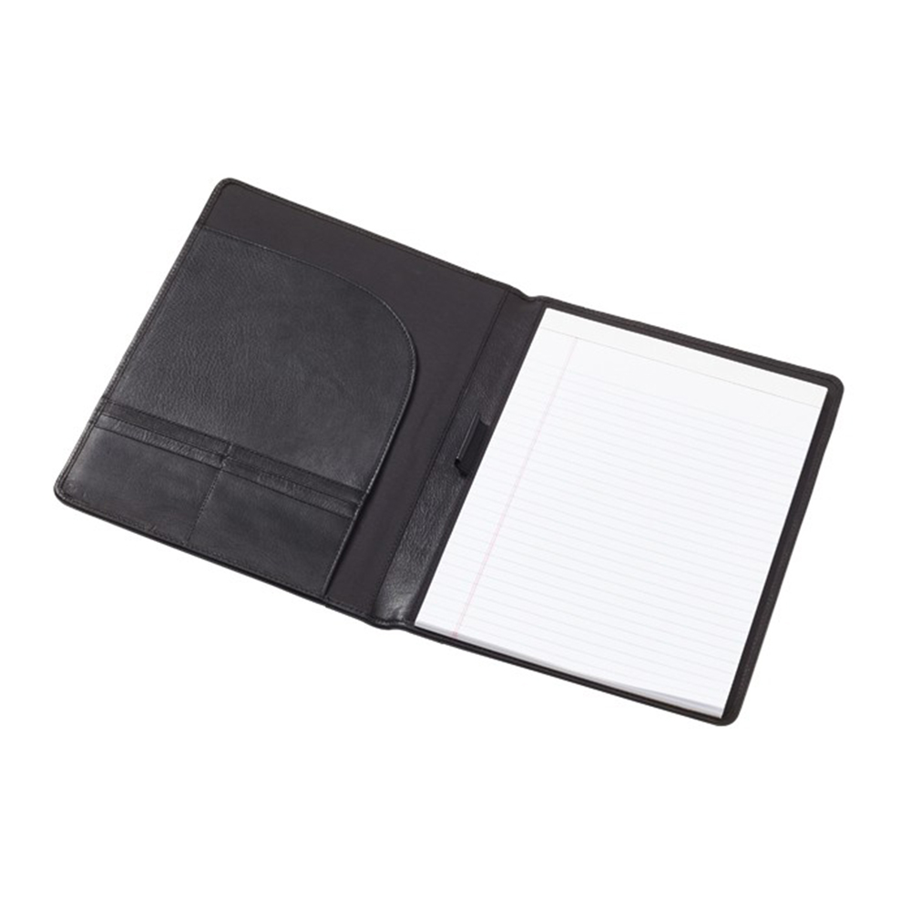 Sophisticated yet practical, leather goods are a timeless corporate gifting choice. Leather gifts are durable, long-lasting, and sure to leave an impression on your recipient. Secure contracts, resumes, proposals and other important documents at meetings or on-the-go with this custom leather portfolio. Your associates will appreciate the sophisticated, professional feel that this luxe leather folder adds when meeting prospective clients or partners. Opens to reveal a slash pocket, four card slots, pen holder and an 8.5" x 11" pad of paper.