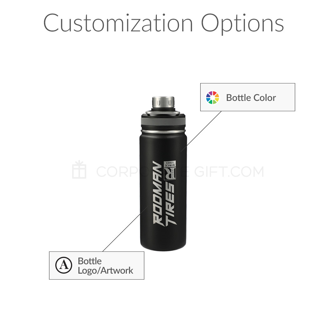 $55 one-time setup fee. Price includes bottle and a laser imprint in one location. A virtual mock-up will be sent out for approval prior to processing.