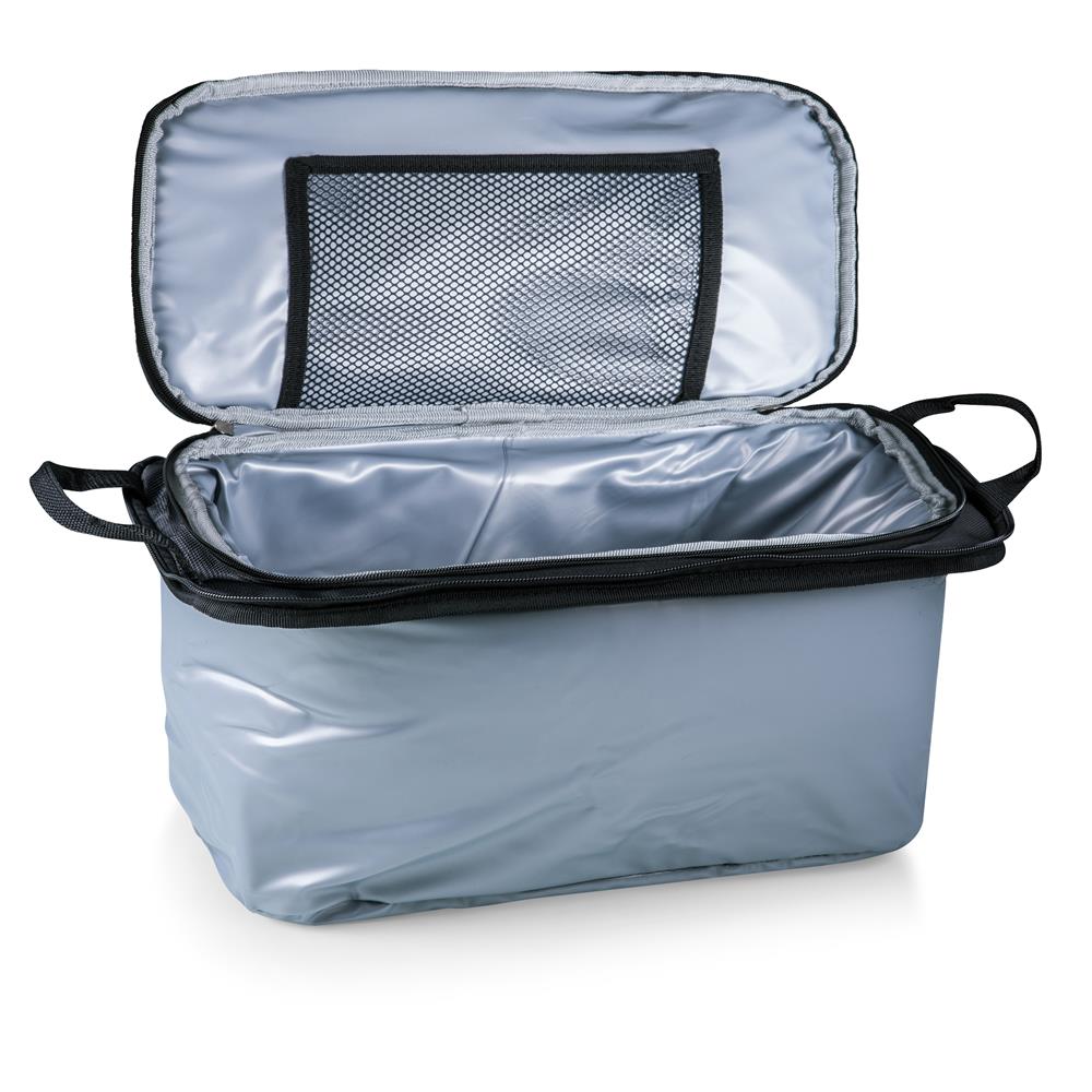Picnic Time is proud to introduce our patented Vulcan Portable Propane Grill & Cooler Tote, a travel grill set and insulated cooler in one! A 16-can capacity, fully-removable cooler nestles securely into the main compartment which holds the portable LP (propane) bbq grill and lid, and an exterior zip-up compartment holds three stainless steel grilling tools with aluminum handles and non-slip thumb grips including: one large spatula with an integrated bottle opener, one bbq fork, and tongs. Exterior pockets with drawstring closures are designed to hold camp propane tanks (not included). With an adjustable shoulder strap with comfort pad, a reinforced waterproof base, three large zippered exterior pockets to store personal effects, padded carry handles, and a stretch cargo cord on the top of the tote to carry a blanket or towel, this BBQ kit will win the tailgate party, hands down!