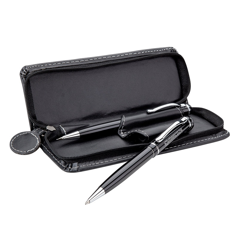 Brass twist-action ballpoint and twist-action pencil with satin finish and metal clip. Set comes in a leatherette case with white contrast stitching and zippered closure.
